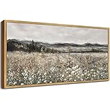 SHENIFY 20x40in Extra Large Vintage Framed Wall Art Meadow with Flowers Landscape Painting Retro Scenery Farmhouse Bedroom Above of Bed Living Room Decor - Natural Framed